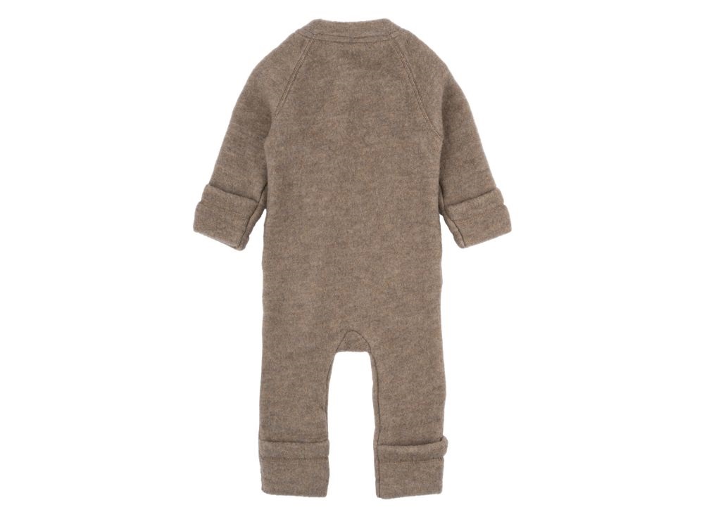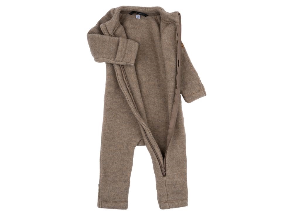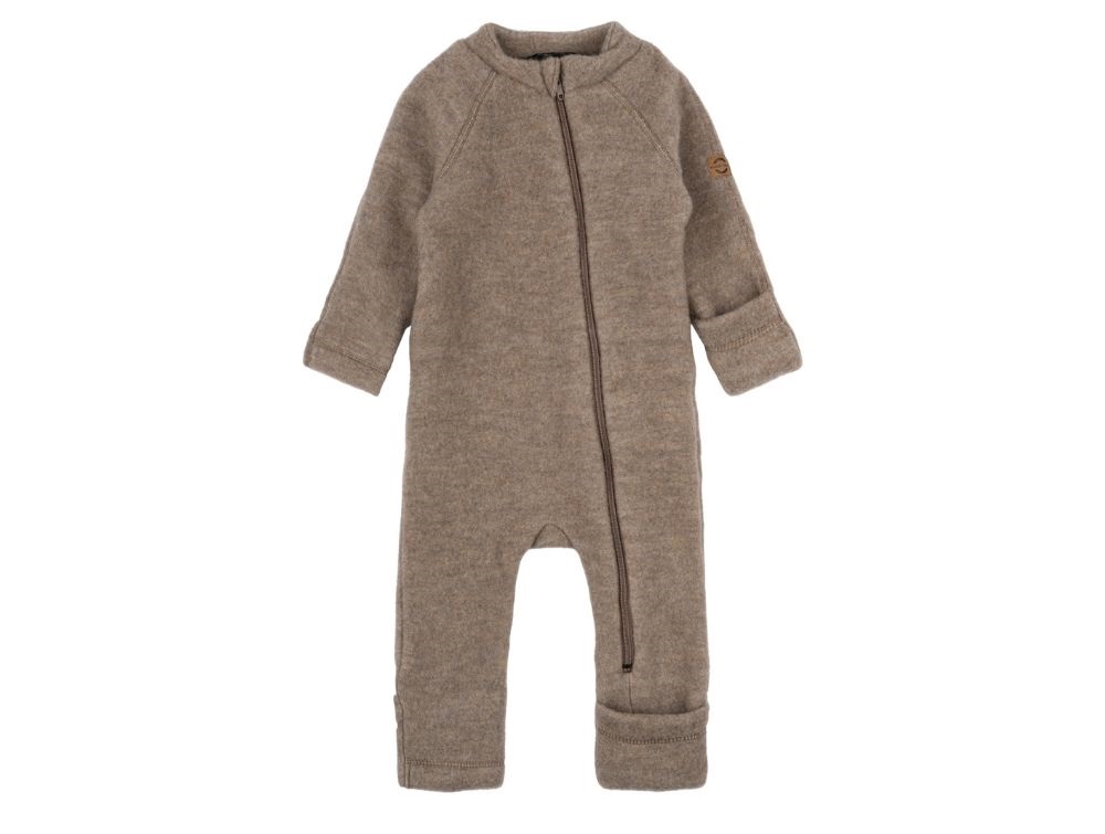 Mikk-Line ulddragt i brun nuance (melange denver) lavet i blød merinould uden mulesing. Dragten har en lang YKK-lynlås og praktiske vendbare ærme- og benkanter, som kan lukkes om hænder og fødder.