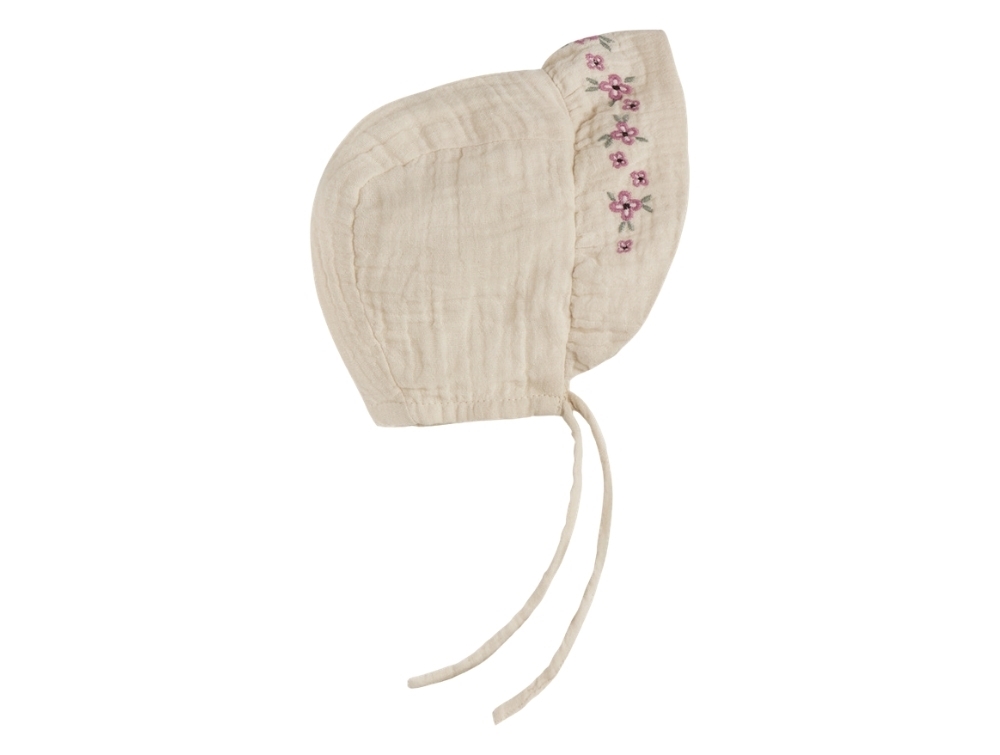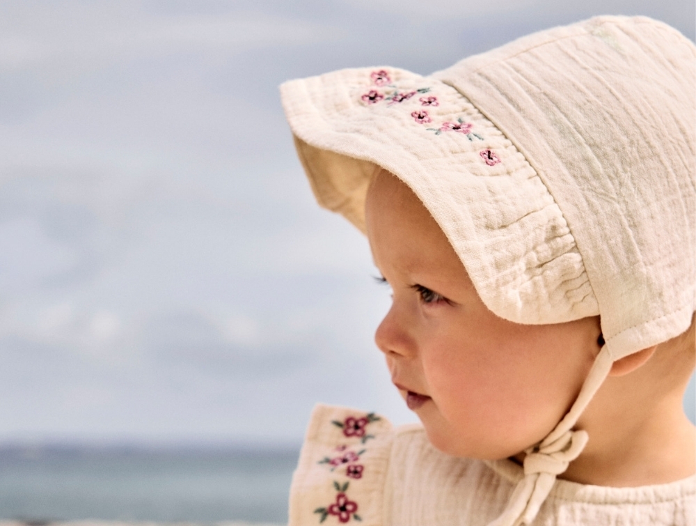 Name It baby solhat i raahvid med bindebaandName It solhat i raahvid nuance med blomsterbroderiName It solhat i muslin med broderede blomsterName It solhat i raahvid nuance med skygge og snore