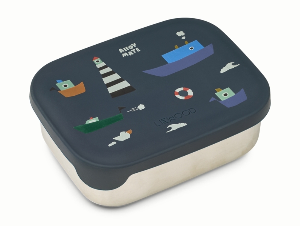 Liewood Arthur lunchbox i classic navy med sailing printLiewood Arthur lunchbox med silikone låg og sejlprintLiewood Arthur lunchbox i rustfrit stål med tre rum