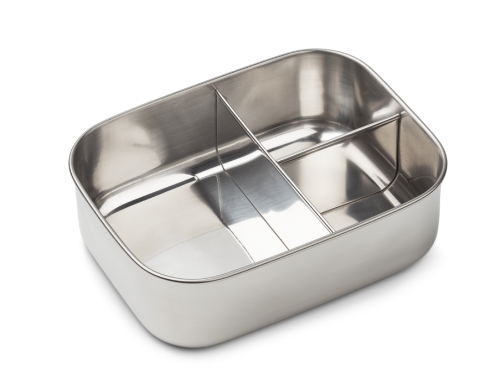 Bunden er fremstillet i rustfrit stål, og det fleksible låg i silikone gør det nemt for barnet selv at åbne og lukke. De opdelte rum holder snacks og mad adskilt og organiseret.