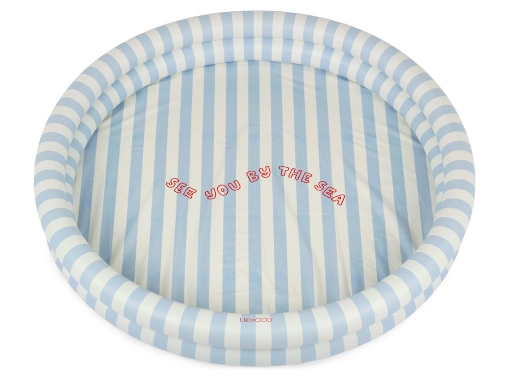 Stribet badebassin fra Liewood med lyseblå og råhvide striber og teksten see you by the sea i bunden LW19952 2457