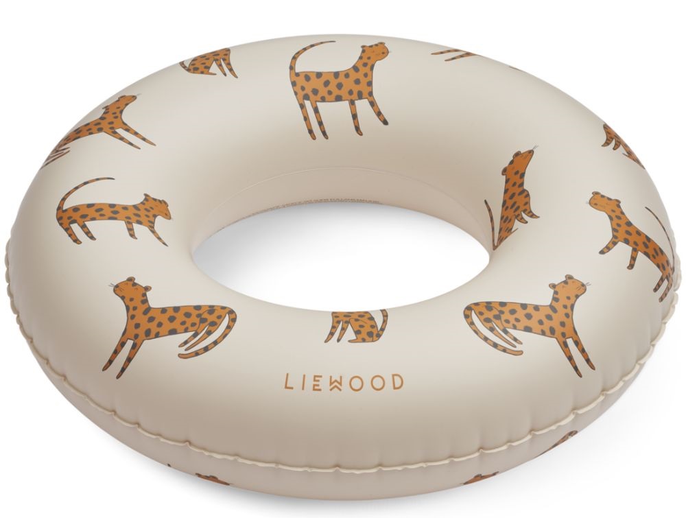 Den oppustelige badering har et stilfuldt leopardprint på en lys sandfarvet baggrund og er ideel til sjov i poolen eller ved stranden. Den er let og nem at pakke sammen, hvilket gør den praktisk at tage med på ferier og udflugter.