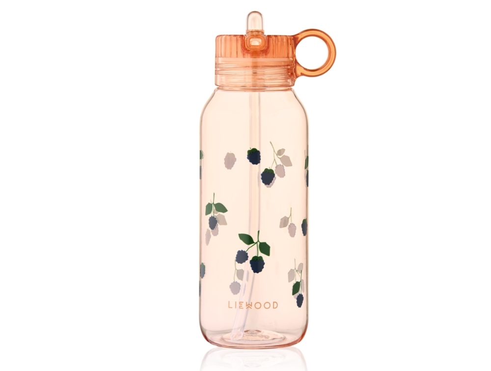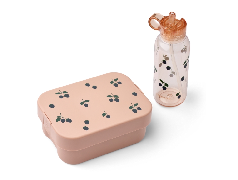 Madkasse sæt fra Liewood. Sættet består af en praktisk madkasse med ruminddeling, tilhørende smart gaffel og ske i én og en drikkedunk med sugerør. Madkassen og drikkedunken er dekoreret med fine bærprint.