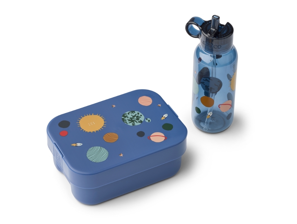Madkasse sæt fra Liewood. Sættet består af en praktisk madkasse med ruminddeling, tilhørende bestik og en drikkedunk med sugerør. Madkassen og drikkedunken er dekoreret med fine planet- og rumprint.