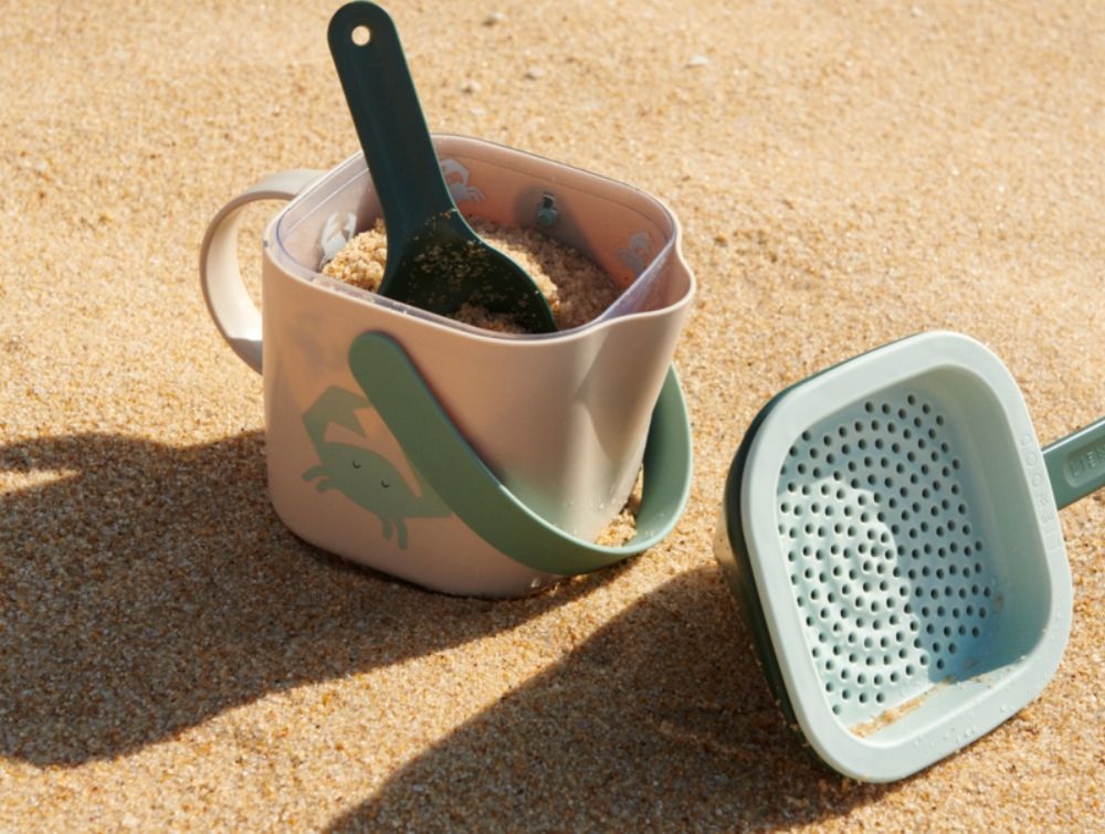 Dette sandlegesæt fra Liewood er perfekt til stranden, sandkassen og i naturen. Sættet består af en vandkande, en gennemsigtig spand, en tragt, en skovl og en si – alt, hvad dit barn behøver for timevis af leg og udforskning i sand og vand.