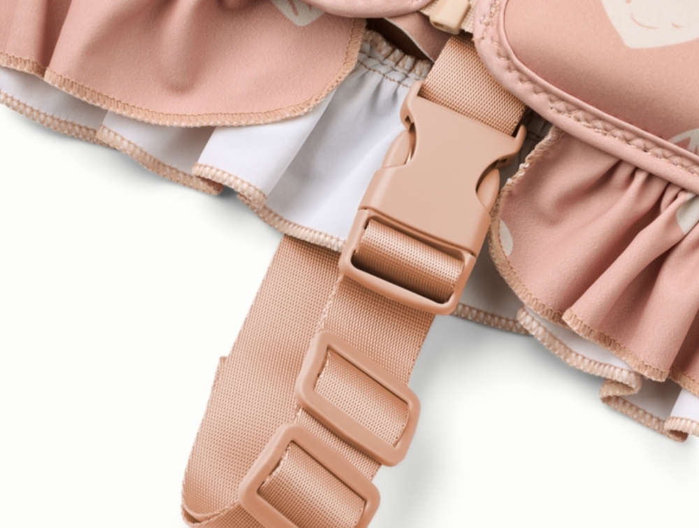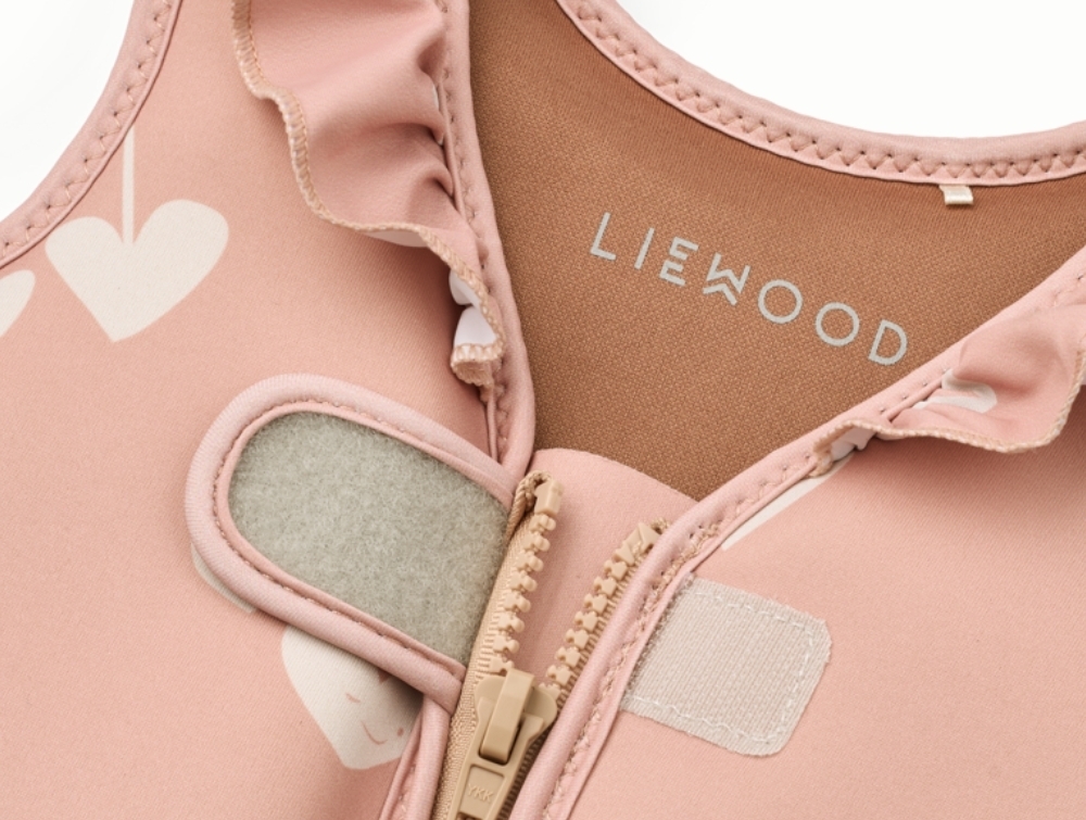 Liewood Dove svømmevest i rosa nuance med hjerteprint og flæser set forfraLiewood Dove svømmevest i rosa nuance med hjerteprint set bagfraDetalje af Liewood Dove svømmevest med lynlås, velcro og neoprenmaterialeDetalje af Liewood Dove svømmevest med flæser, skridtrem og spænde