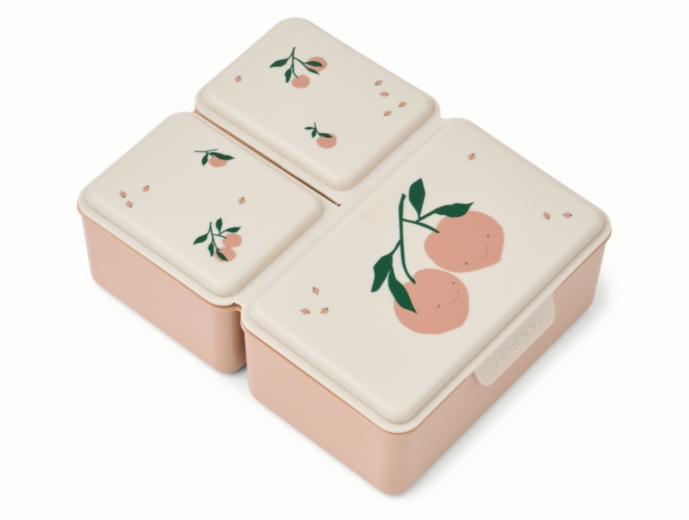 Madkasse i lyserød og beige nuancer fra Liewood med fersken motiver.