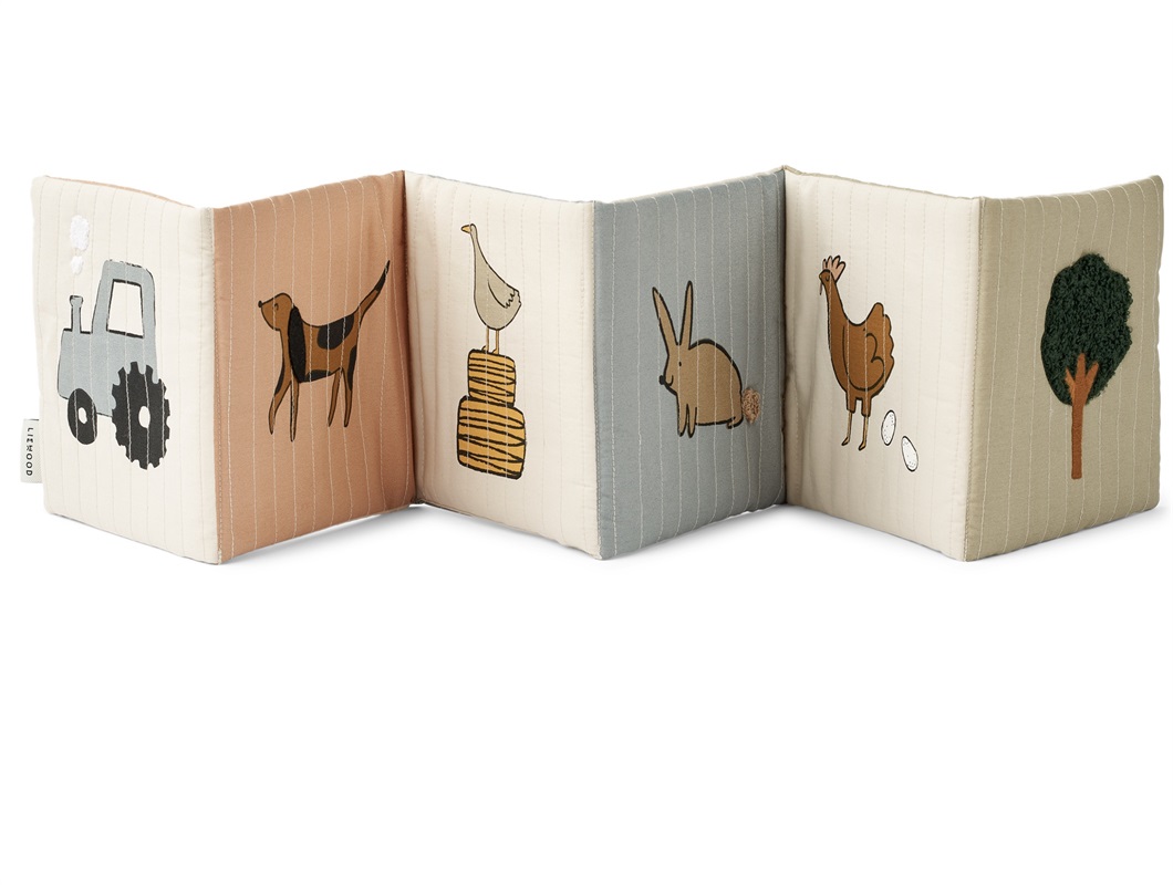 Sød og blød stofbog, som kan foldes ud, med bondegårdstema fra Liewood.
