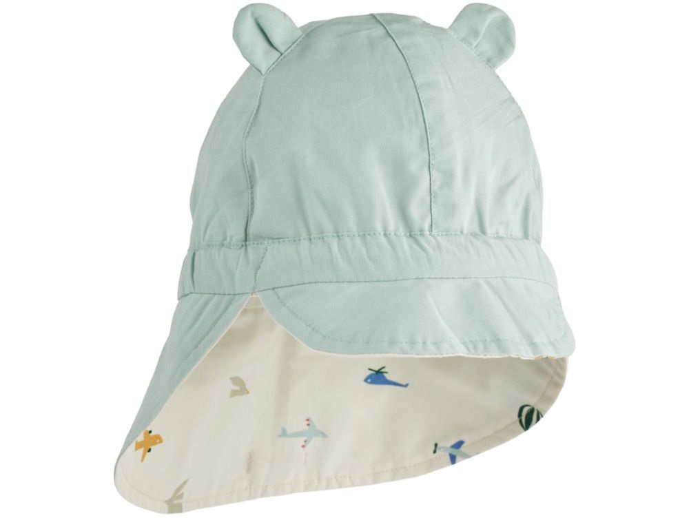 Vendbar babysolhat med små ører i farven ecru med print af luftfartøjer på den ene side af solhatten fra Liewood.
