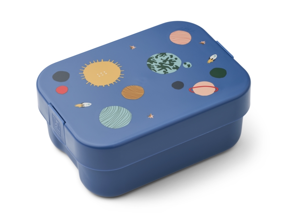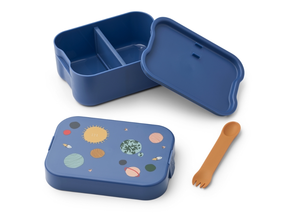 Blå madkasse fra Liewood. Madkassen er dekoreret med sjove rum- og planetprint og kommer med tilhørende ske/gaffel-i-én bestik.
