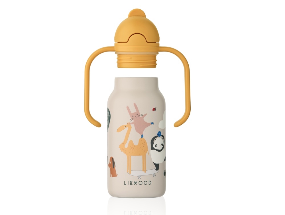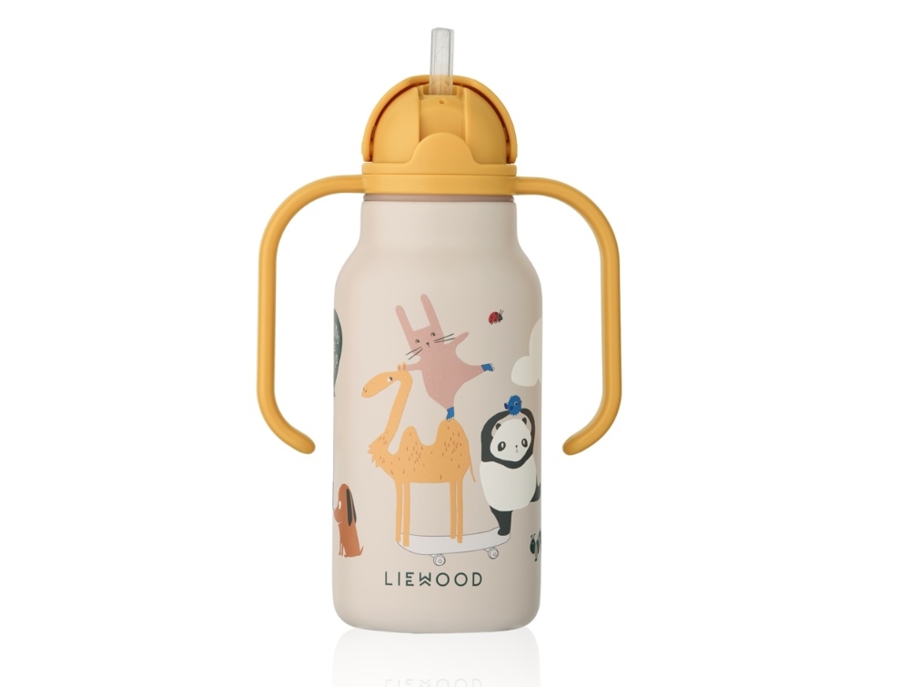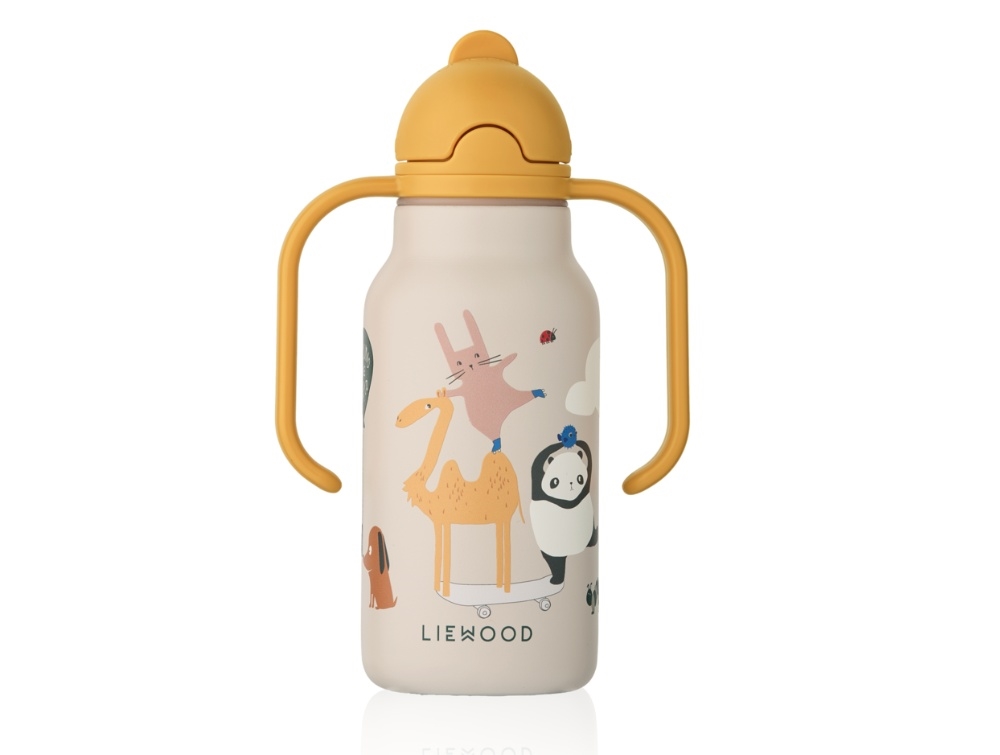 Drikkedunk i beige nuance med Around the World-print fra Liewood. Kimmie flasken er lavet af rustfrit stål med låg i polypropylen og sugerør i silikone, og den er designet specielt til små hænder.