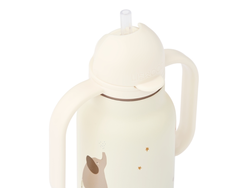 Vandflaske i cremefarvet nuance fra Liewood med sødt elefantprint og praktiske håndtag, som gør den nem for små børn at holde.