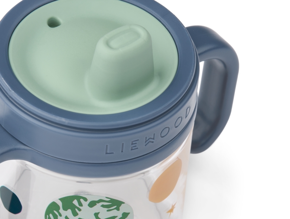 Drikkekop i klar plast med planet-print fra Liewood. Koppen har to håndtag, blød silikone drikketud og praktisk låg til at dække tuden.