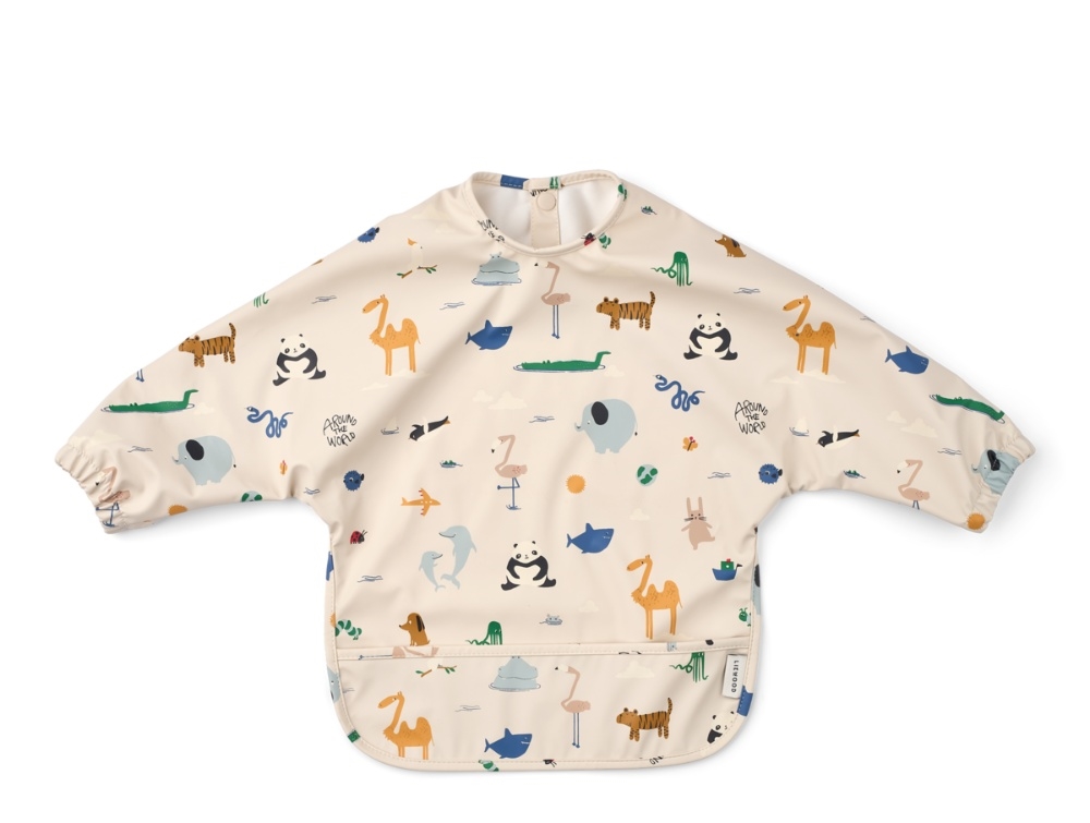 Hagesmæk med lange ærmer i beige nuance med dyreprint fra Liewood. Merle hagesmækken er let, praktisk og designet til babyer og småbørn, der lærer at spise selv.
