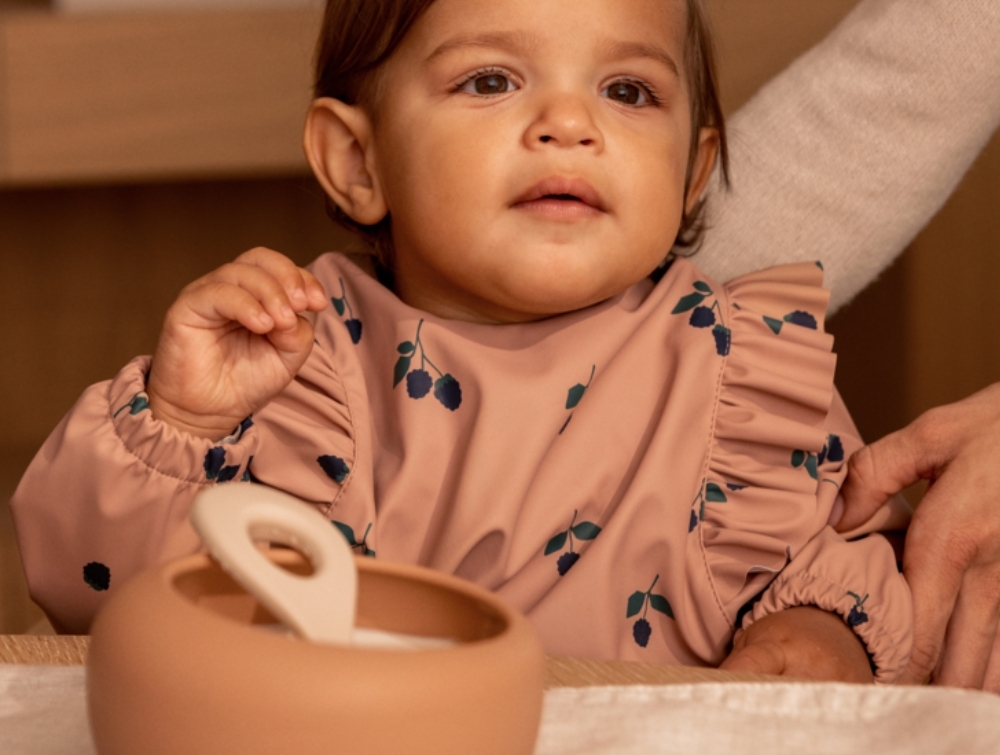 Praktisk hagesmæk/spiseforklæde med lange ærmer og rynkede flæser ved skuldrene. Fremstillet i let og blødt materiale med en vandafvisende PU-coating, der beskytter barnets tøj under måltiderne. Hagesmækken har elastik ved ærmerne og en opsamlingslomme foran.