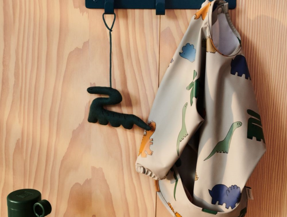 Langærmet spiseforklæde med dinosaurusprint og vandafvisende overflade fra Liewood: