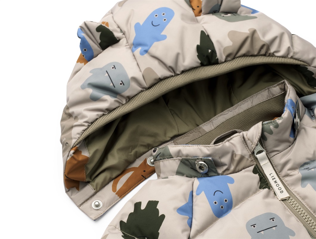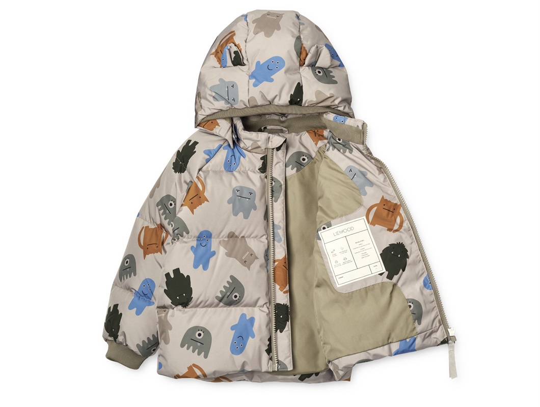 Vinterdunjakke i farven koala med sødt monsterprint fra Liewood.
