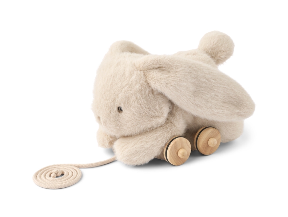 Kanin trækdyr fra Liewood. Det bløde plyslegetøj har fine lange ører og små træhjul.