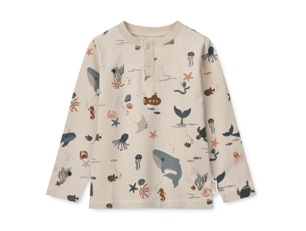 Wilhelm pyjamas i sandy nuance med fint havdyrprint fra Liewood. Pyjamassen er fremstillet i blød, økologisk bomuld med lidt elastan for ekstra bevægelsesfrihed.