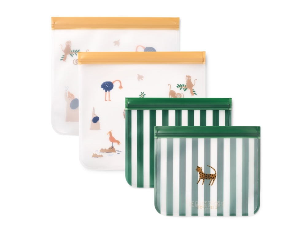 Snack poser fra Liewood med genanvendelig funktion. Poserne har fine dyremotiver og striber i grønne og varme nuancer.