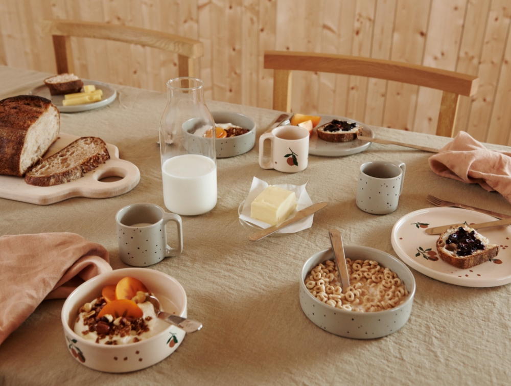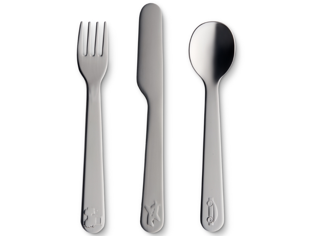 Tåler opvaskemaskine, hvilket gør rengøringen enkel. Sættet indeholder en gaffel, en kniv og en ske.