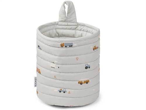 Lille quiltet vægkurv til opbevaring i farven dove blue med printet vehicles fra Liewood.