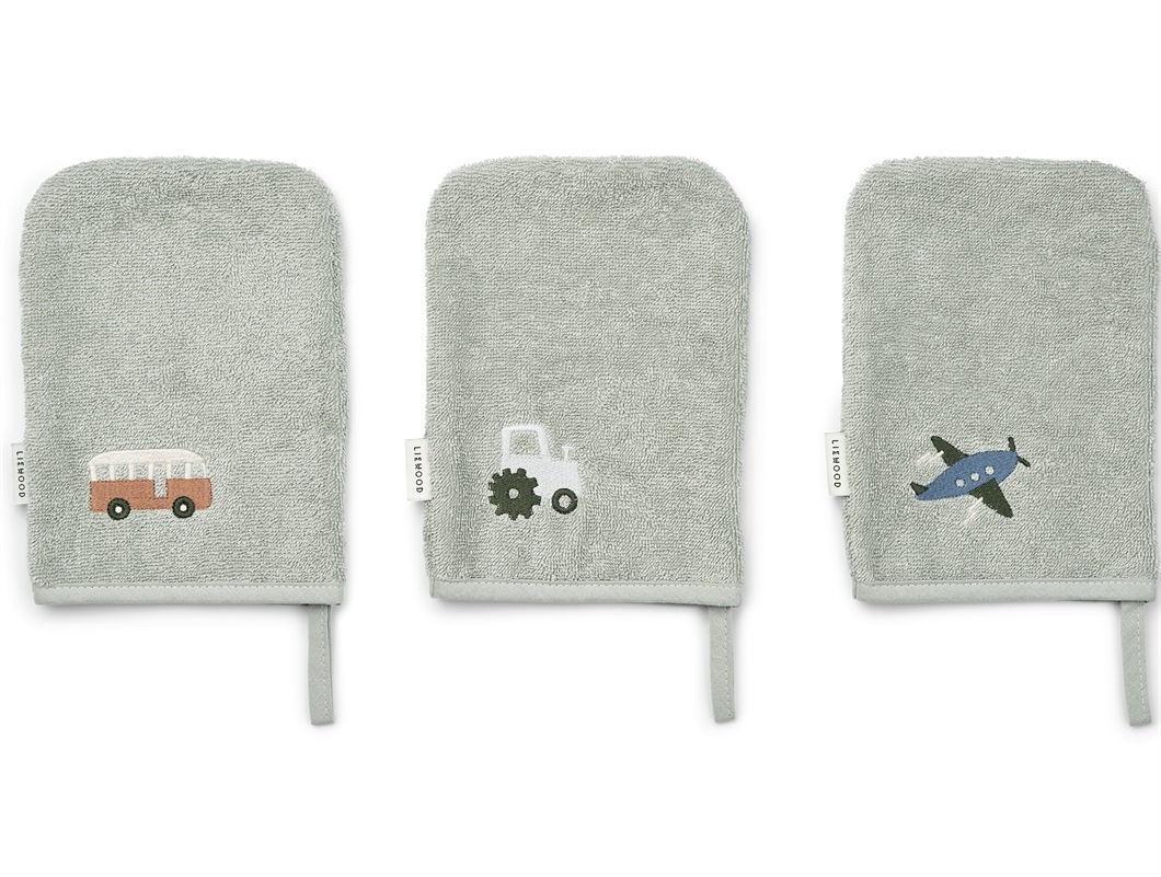 3 vaskeklude i økologisk bomuld i farve dove blue med lille broderi af køretøjer fra Liewood.