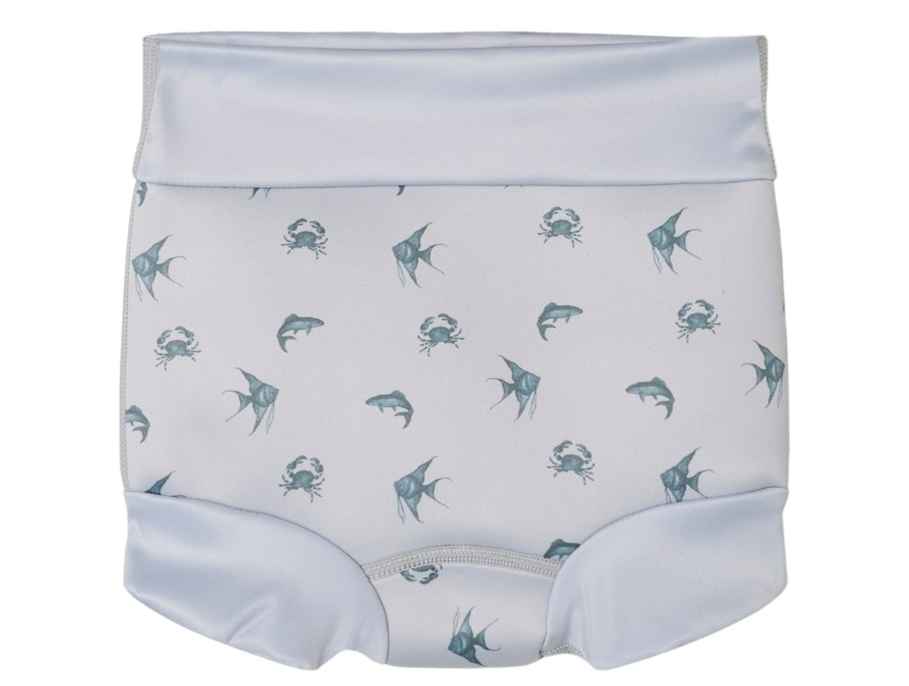 Neopren badebukser til babyer i farven vapor blue med sødt print af forskellige havdyr fra Lil' Atelier.