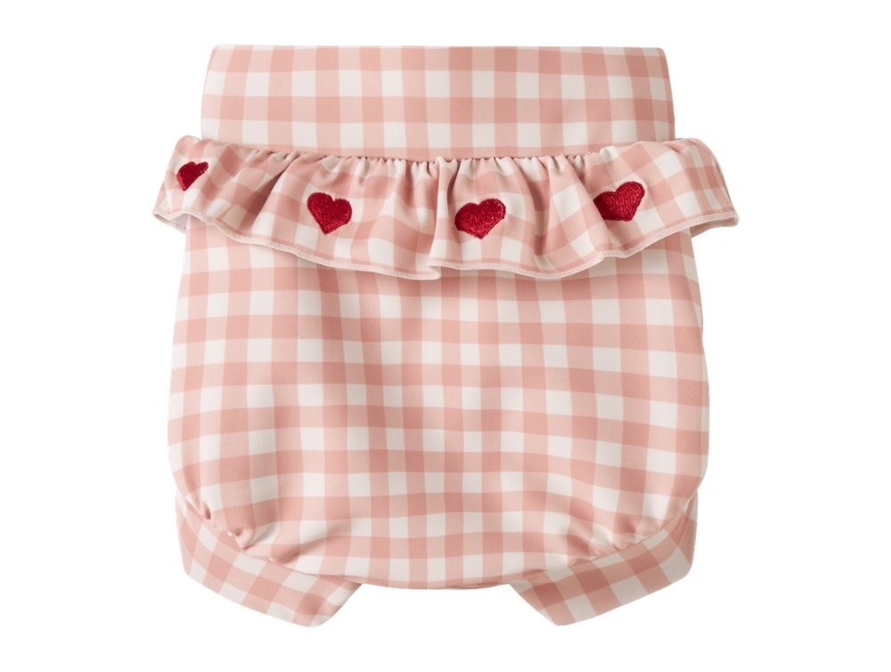 Modellen har ternet mønster, flæsekant i taljen og små broderede hjerter som dekorativ detalje.