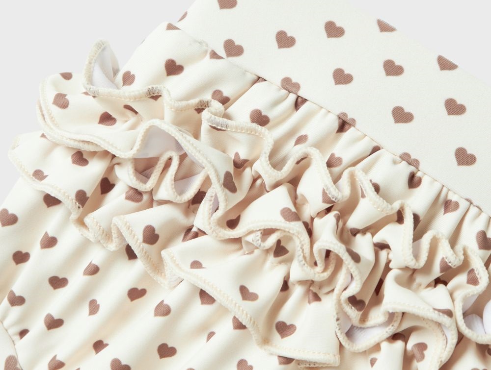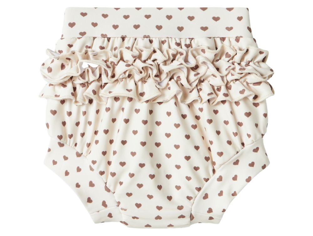 Badebloomers fra Lil Atelier i råhvid med små brune hjerter og flæser i siderne 132213574 turtledoveBadebloomers fra Lil Atelier i råhvid med små brune hjerter og flæser bagpå 132213574 turtledoveFlæsedetalje på råhvide babybadebukser med hjerteprint fra Lil Atelier 13213574 turtledove
