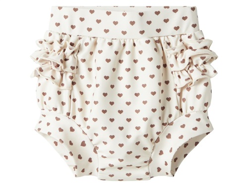 Søde badebloomers i råhvid (turtledove) med fine brune hjerter. Modellen har flæsedetaljer i siderne og bagpå, som giver et feminint og legende udtryk. De er designet til babyer og har blødt strækstof i taljen og ved lårene, hvilket sikrer en behagelig pasform og god bevægelsesfrihed – ideel til strand og pool.
