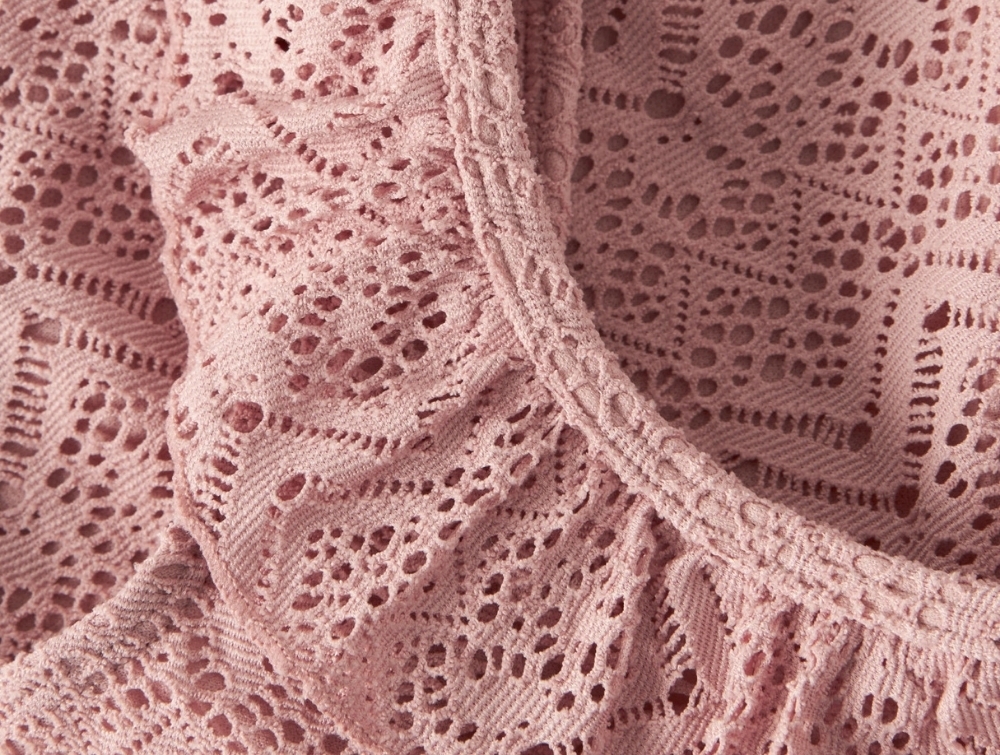 Modellen har dekorativ flæsekant ved halsudskæringen og et fint hulmønster i stoffet.