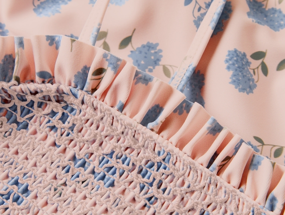 Modellen har blomsterprint, smockdetalje foran og dekorativ flæsekant langs overkanten.