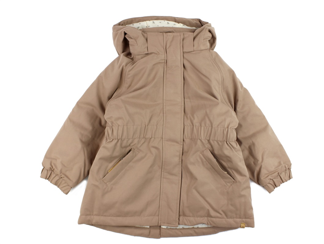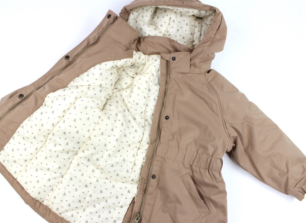 Vinterjakke i farven beaver fur fra Lil' Atelier. Vinterjakken har en aftagelig hætte med trykknapper.