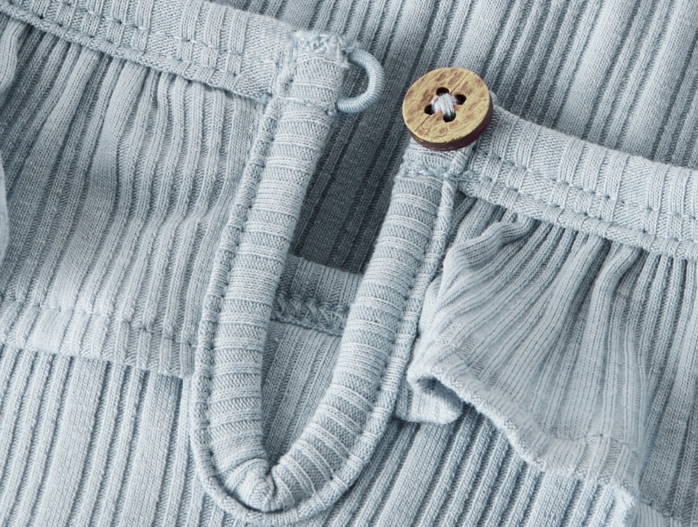 Designet har rund hals med knaplukning i nakken samt lange ærmer med flæsekant ved håndleddene. Pasformen er almindelig pasform med en let tætsiddende form, og den fine ribstruktur giver et roligt udtryk.