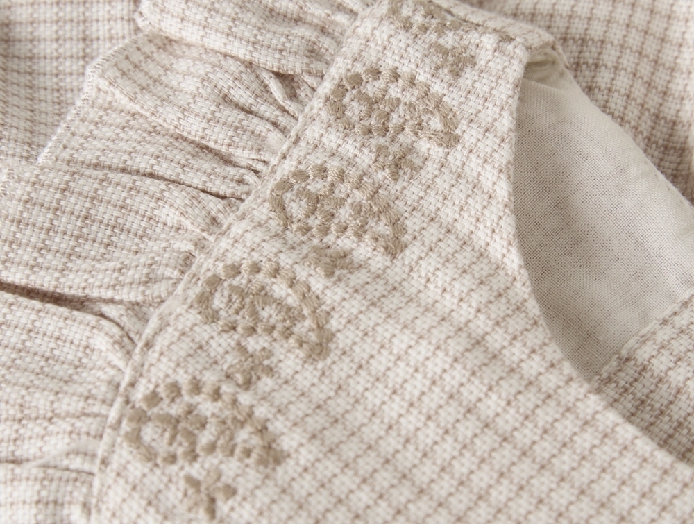 Modellen har et fint ternet beige mønster, broderidetaljer samt flæsekant ved halsen.