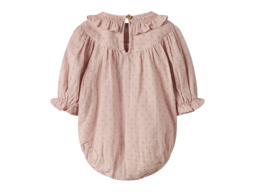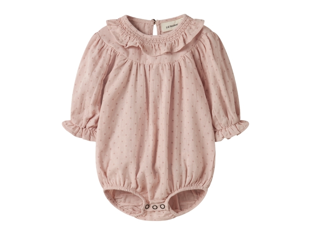 Body i rosa nuance (peach whip) fra Lil' Atelier med fine prikker og dekorativ flæsekrave med smockdetalje.