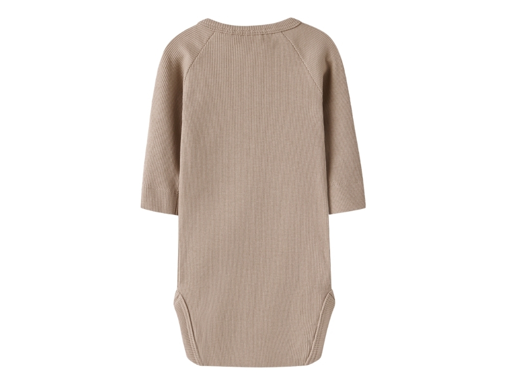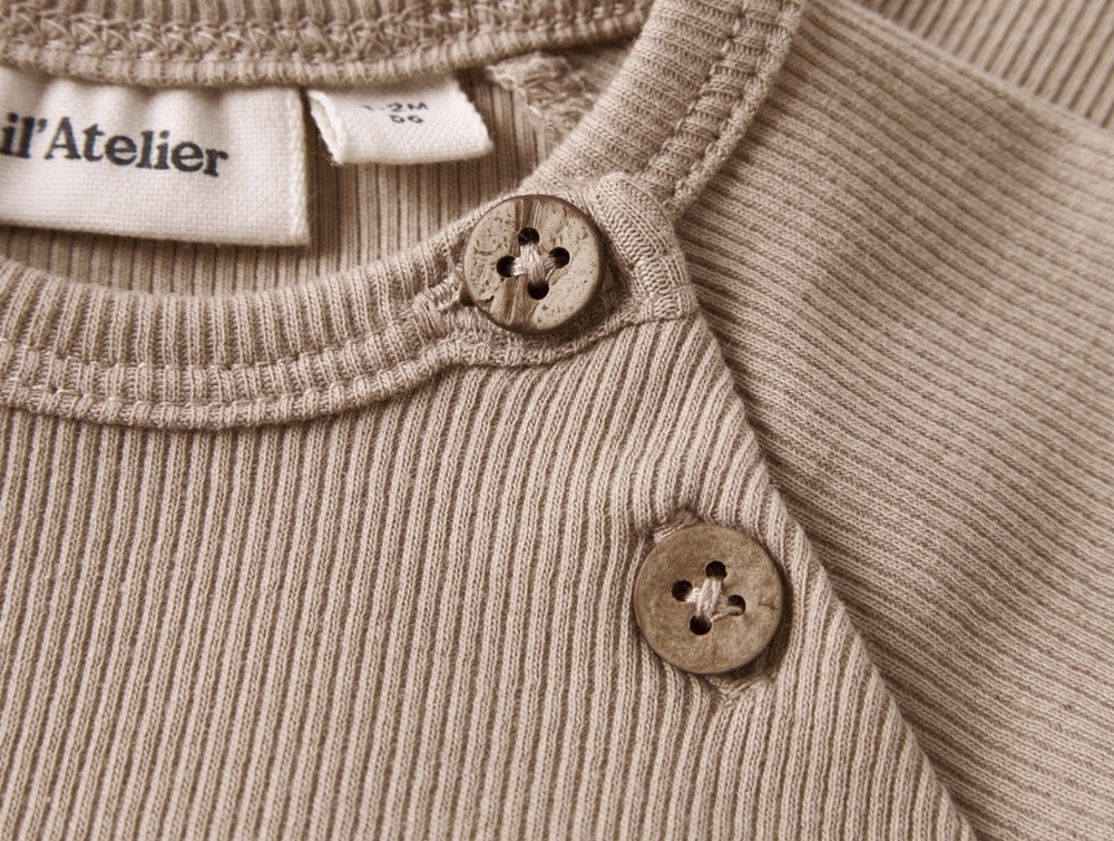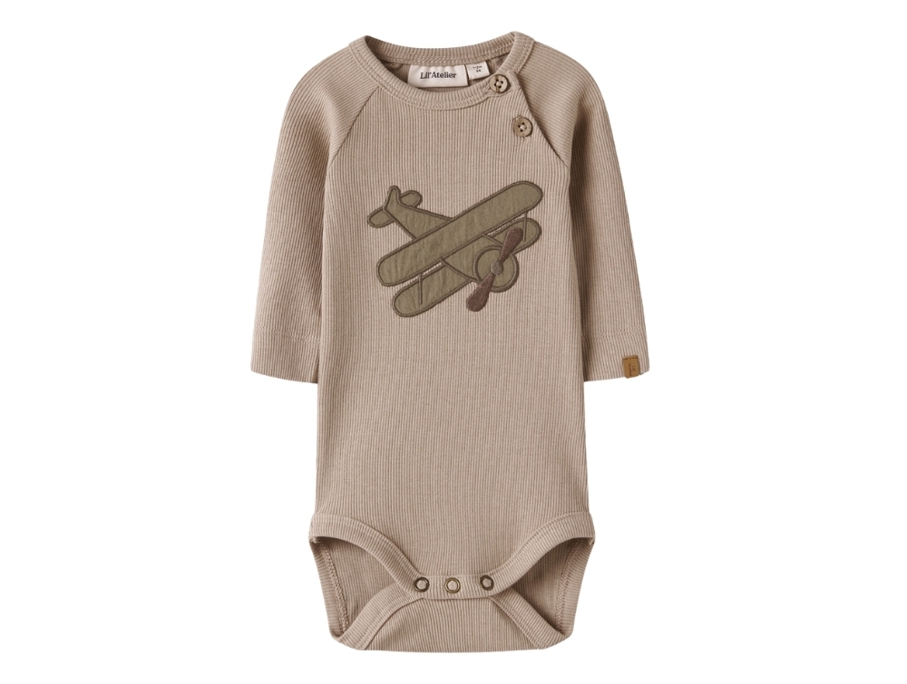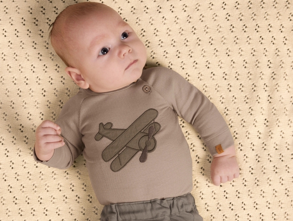 Baby iklædt Lil\' Atelier body i beige nuance med fly printLil\' Atelier body i beige nuance med fly printLil\' Atelier body oxford tan med knaplukningLil\' Atelier langærmet body med ribstruktur