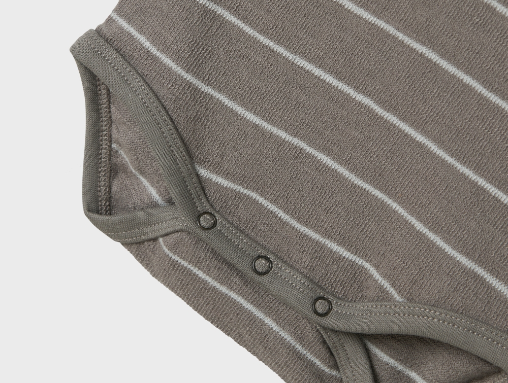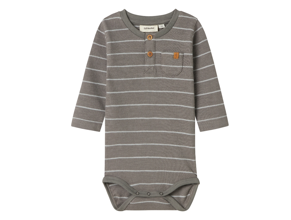 Skøn body i grå med smalle hvide striber. Modellen har en lille lomme på brystet og stolpelukning i halsudskæringen. Praktisk trykknaplukning mellem benene gør bleskift nemt og hurtigt. Den bløde bomuldskvalitet sikrer en behagelig pasform for de mindste.