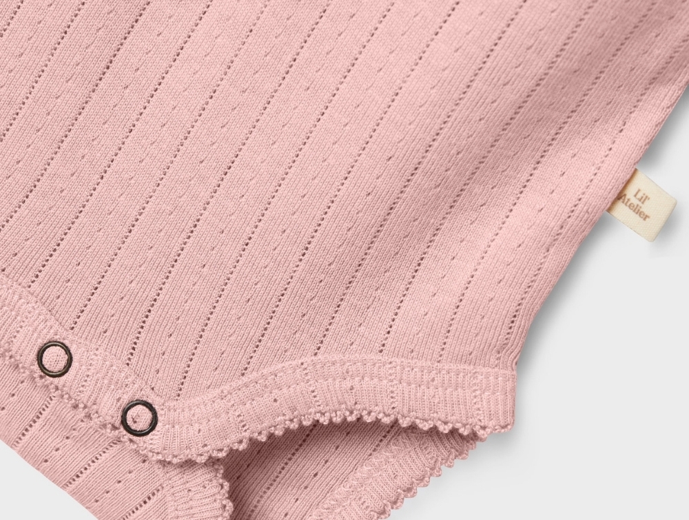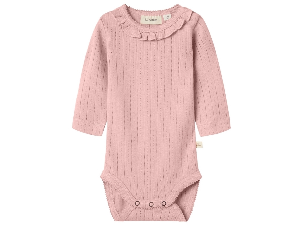 Body i rosa nuance fra Lil' Atelier med sød flæsekrave og hulmønstret ribstruktur. Den har lange ærmer, trykknapper ved skulder og i bunden for nem påklædning.