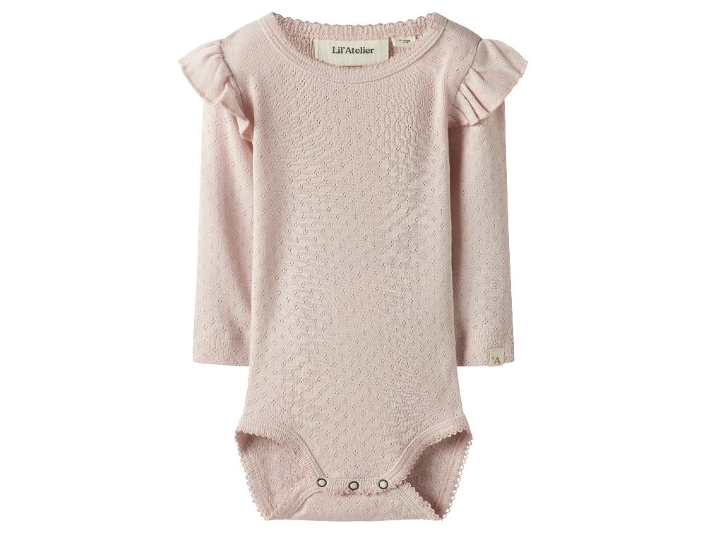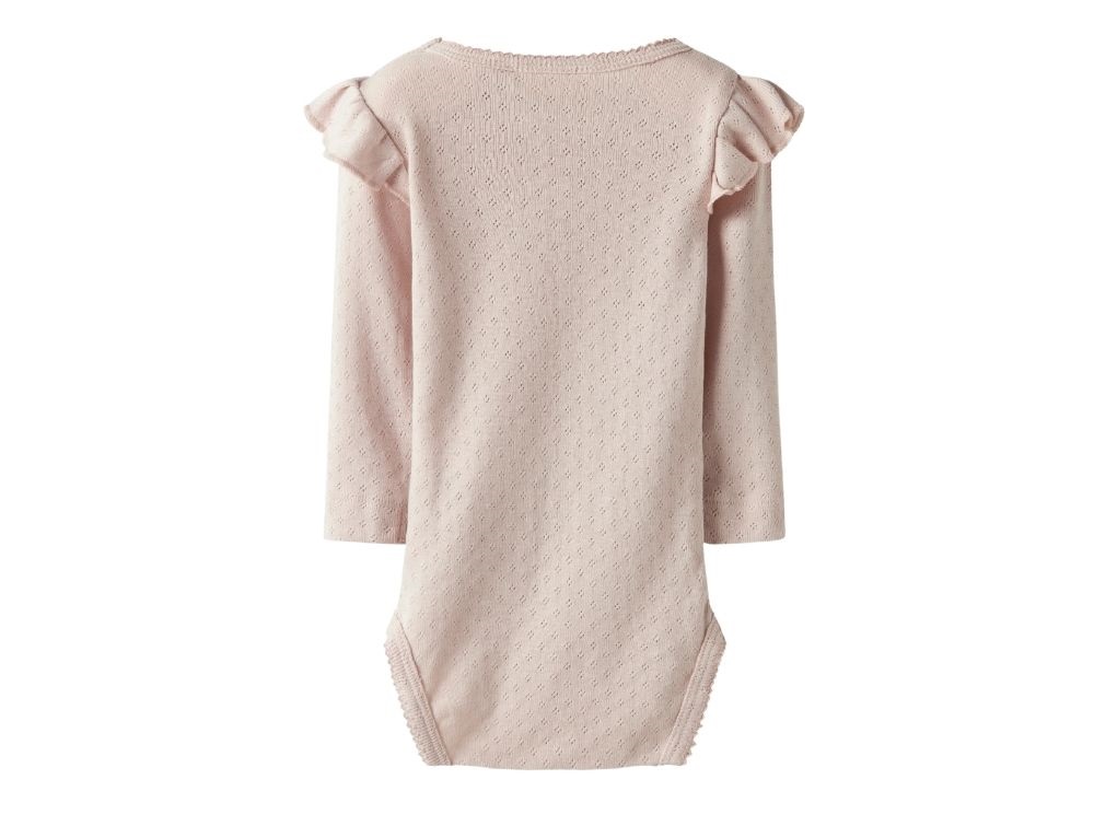 Den bløde body er lavet af 50% økologisk bomuld og 50% TENCEL™ Modal, hvilket giver en let og strækbar kvalitet. Designet har en rund hals, lange ærmer og fine flæsedetaljer, der tilføjer et sødt udtryk.