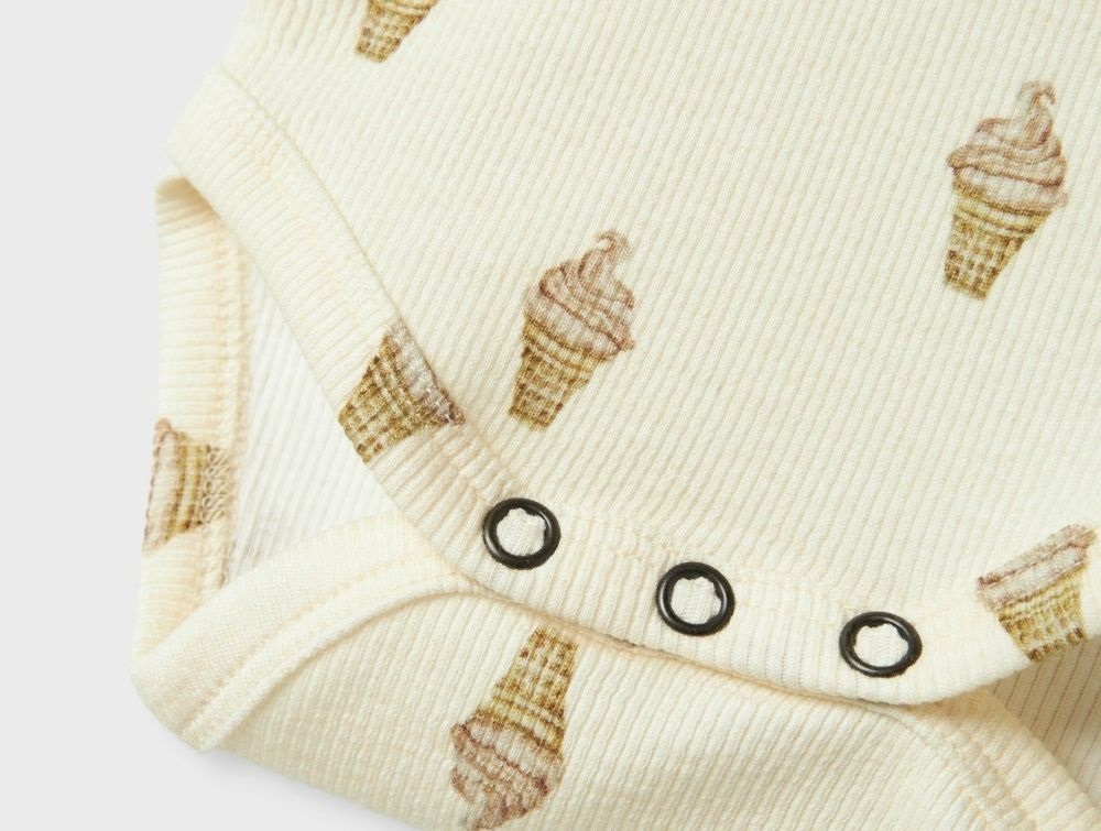 Den bløde body er lavet i strækbar jersey med et sødt vaffelisprint over hele stoffet. Designet har en bedstefar-halsudskæring, lange ærmer og fine babylock-detaljer, der giver en elegant finish.
