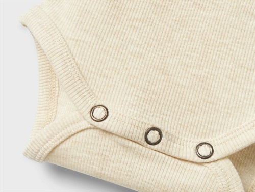 Langærmet body i blød ribkvalitet med rund halsudskæring og fin flæsekrave. Modellen har trykknaplukning ved skulderen og mellem benene, hvilket gør den nem at få af og på – også ved bleskift.