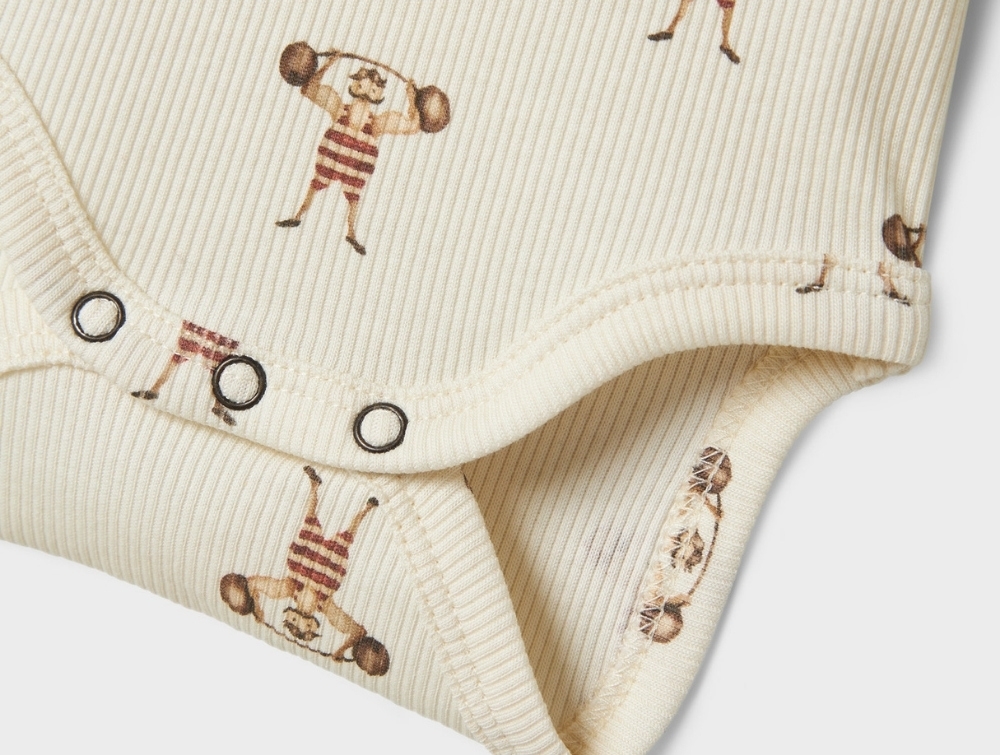 Ribbet body i råhvid nuance fra Lil' Atelier med charmerende vægtløfterprint over hele stoffet. En blød basisstyle til hverdagens brug.