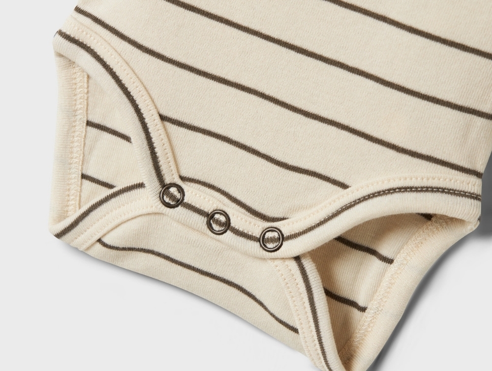 Body i råhvid nuance fra Lil' Atelier med tynde brune striber. Modellen har rund hals og trykknapper på den ene skulder og mellem benene, hvilket gør den let at tage af og på. Den bløde jerseykvalitet med stræk sikrer god komfort og bevægelsesfrihed for baby.