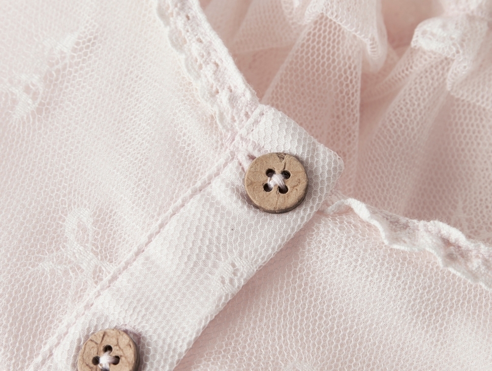 Lil\' Atelier babykjole i almost mauve med tyl og flæserDetalje af knaplukning på Lil\' Atelier babykjole i almost mauveBagside af Lil\' Atelier babykjole i almost mauve med tyl