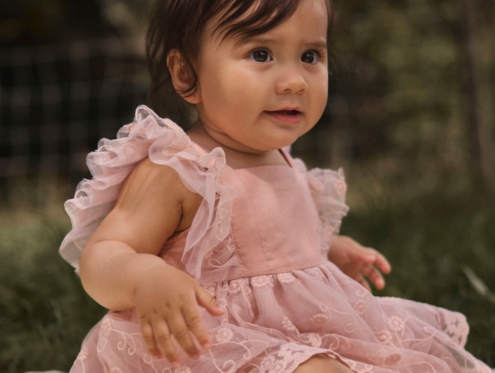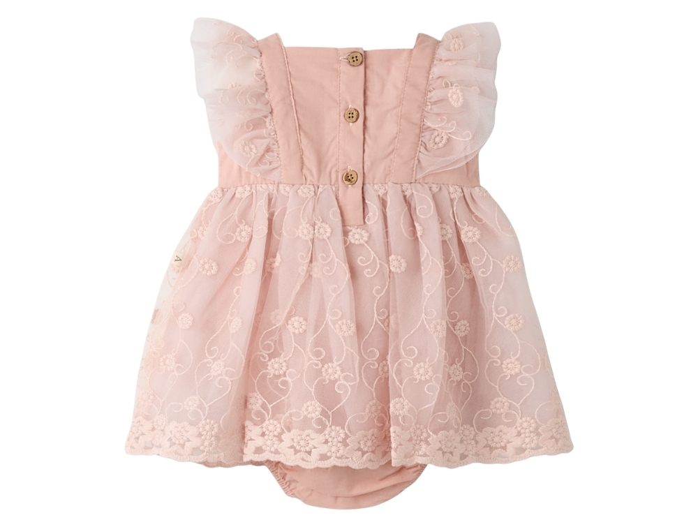 Bodyen er fremstillet i 100% bomuld (økologisk), som føles blødt mod huden, mens kjoledelen har et let lag tyl med broderede detaljer. Det gør modellen velegnet til dage, hvor der gerne må være lidt ekstra fine detaljer i garderoben.