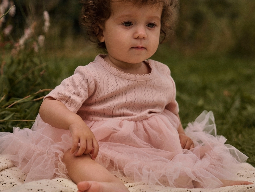 Bodydelen er fremstillet i 70% bomuld (økologisk) og 30% polyester (genanvendt), som føles blødt og giver god bevægelsesfrihed. Tylskørtet tilfører et let lag og skaber ekstra volumen i nederdelen.