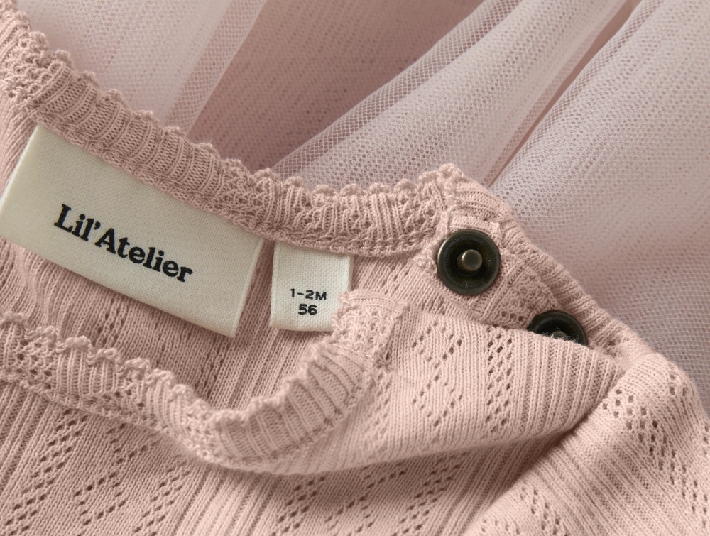 Lil\' Atelier bodykjole i lyserod nuance med tylskoert set forfraLil\' Atelier bodykjole i lyserod nuance med tylskoert pa barnLil\' Atelier bodykjole i lyserod nuance med struktur i stoffet ved halsLil\' Atelier bodykjole i lyserod nuance med tylskoert set bagfra