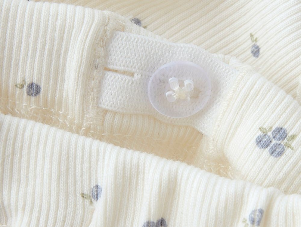 lil\' atelier bukser i råhvid med blåbærprint og bindebånd, set forfrababy iført lil\' atelier bukser med blåbærprint og fødderne løftetnærbillede af justerbar elastik og knap i linningen på lil\' atelier bukser med blåbær